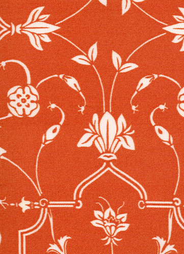 Abu, an interlocking scroll and floral print has a punchy monochromatic impact.