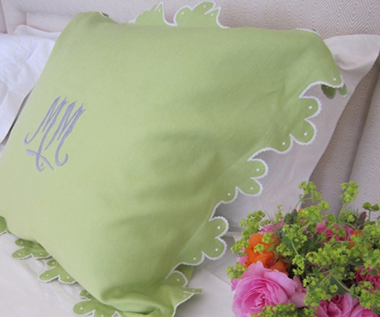 Adding variety to a scallop edge, Julia B.'s Calais has such charm with it's triple edge flange and embroidered dot detail. Add a custom monogram in a wide array of styles, and create something totally custom to your color scheme.